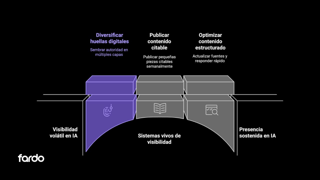 Publicar pequeñas piezas citables cada semana, optimizar contenido estructurado, actualizar fuentes y responder rápido a cada cambio de tendencia.
