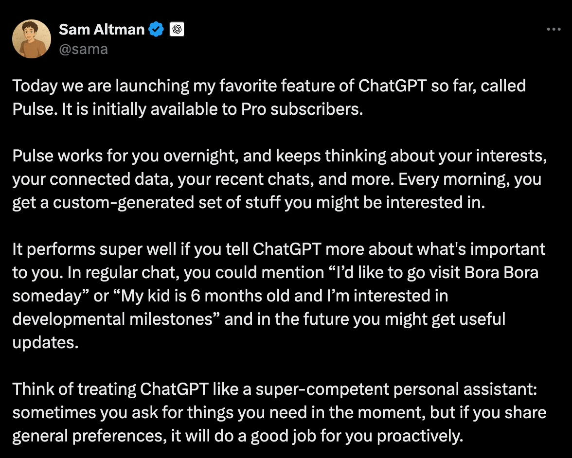 OpenAI lanzó Pulse, una nueva función en ChatGPT que cada mañana arma un briefing personalizado con lo que te importa: tus tareas, tus intereses, tus conversaciones previas. Ya no esperás a preguntarle: ChatGPT te despierta con respuestas listas. Sam Altman lo llamó su “feature favorita”, y no es exageración. Pulse marca el salto de un asistente reactivo a uno que propone.